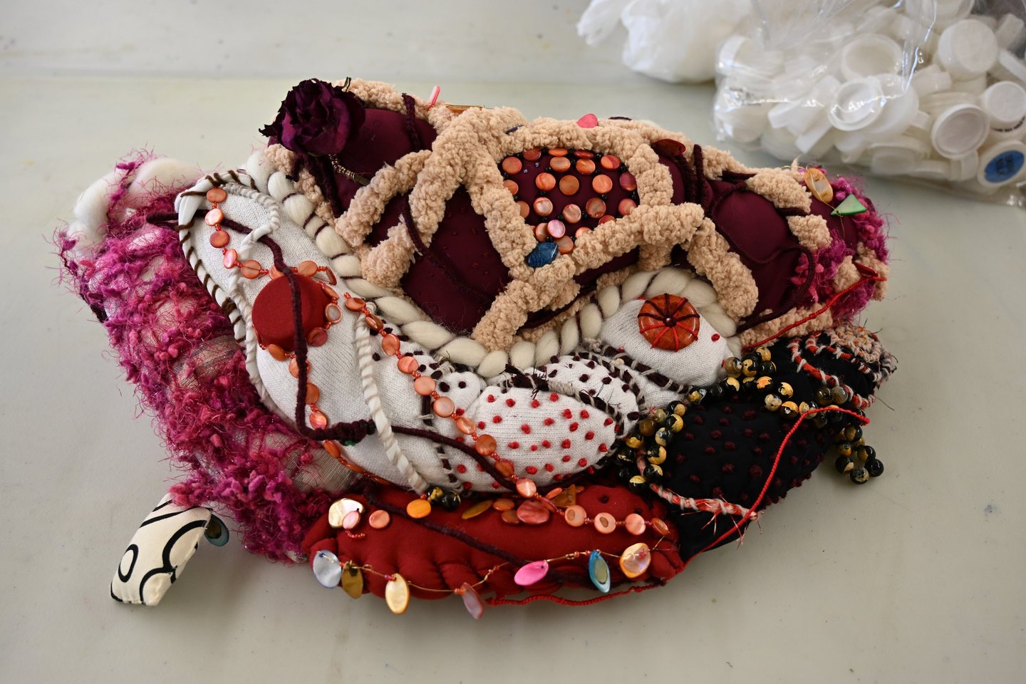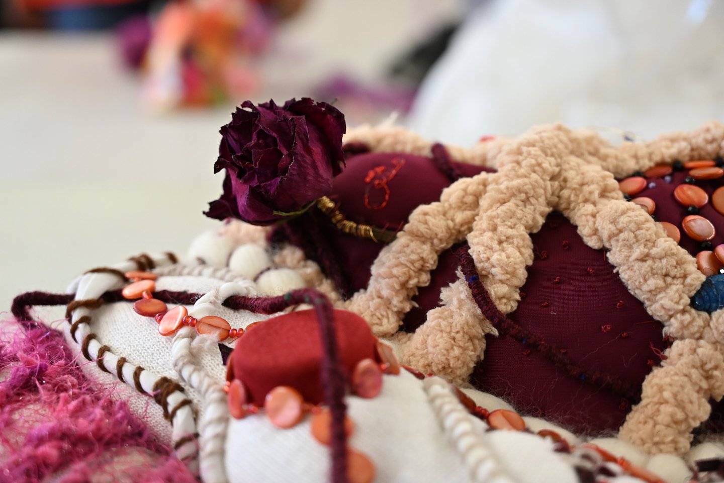 At its center, a dried rose rests, its petals preserved mid-bloom, mid-decay, a reminder that love does not disappear but transforms. The sculpture holds contradiction, the way the heart does: the softness of boucle yarn alongside the hardness of shell beads, the warmth of cream and blush beside the intensity of crimson and black. Nothing here is singular. Everything is accumulated, gathered, stitched together the way memory and feeling collect over time.
