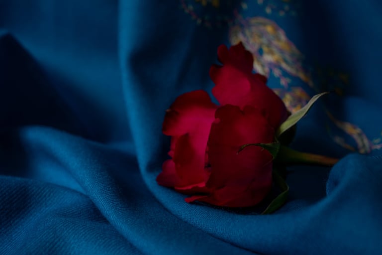 I photographed myself in that moment, and also a red rose resting against the blue. The rose, just beginning to wilt, became a quiet marker of time passing, the seasons that change without us, the distance that grows even as love stays constant.