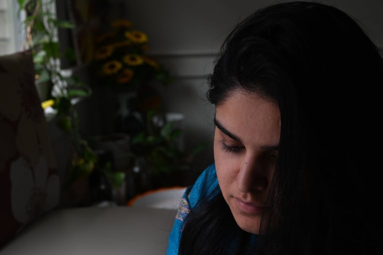 Winter Blues is a series about distance, longing, and the objects that hold us together when we're apart. It centers on a blue shawl my parents gave me when I left India for America. Most days, I keep it folded safely away. But on a winter afternoon, feeling the weight of homesickness, I wrapped myself in it again. The familiar softness brought back my mother's warmth, the security of childhood, the feeling of being held without needing to ask.